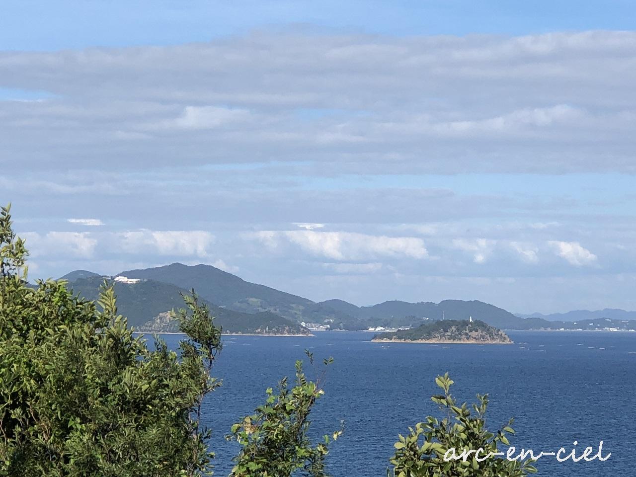 左の白い建物が、昨日泊まった万葉岬に、右手の島は「おわん島」。