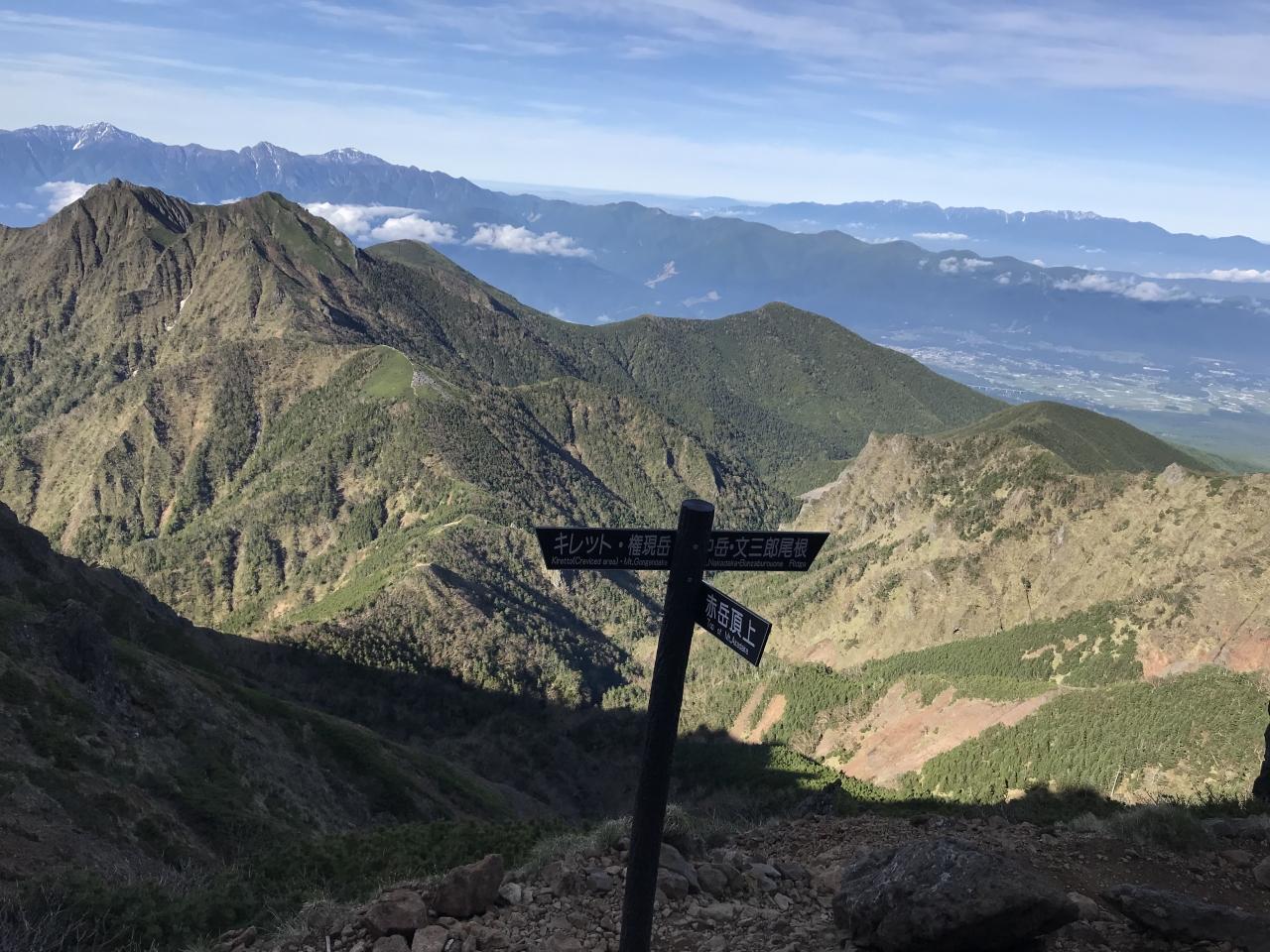 画面中央左側の大きな山が間ノ岳。中央右の尖った山が甲斐駒ヶ岳。その右の雄大な山が仙丈ケ岳です。 -