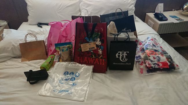 バスでアラモアナセンターからDFSギャラリアで降り、ホテルに戻る最中、降りたDFSギャラリアで、1Fでは、家族や身内、職場にホノルルクッキーカンパニーのクッキーやハワイアンキングの塩ナッツ、ホノルルコーヒーのコーヒー豆を買い、2Fで女友達にロクシタンのボディクリーム、3Fで父親と女友達にサングラスのお土産を買い、JALマイルキャンペーンをやっていて、ボーナスマイルが貰え、JCBカードを使ったので、割引券貰えましたd=(^o^)=bものすごく嬉しかったですo(^o^)o割引券はその日に使いましたp(^^)q近くにあるTo the sea Hawaiiとロコブティックとサンシャインスイムウェアで女友達のお土産に水着を買い、サンシャインスイムウェアにavantishirtsの店員さんがショップスタッフとして居たので、ビックリしました(^.^)シェラトンワイキキ内にあるレインスプーナーでも父親のお土産のTシャツと女友達のお土産の水着買いましたo(^o^)oホテル内にあるローソンで買い忘れたお土産と充電ケーブルを買い、部屋だ少しゆっくりしました(^.^)