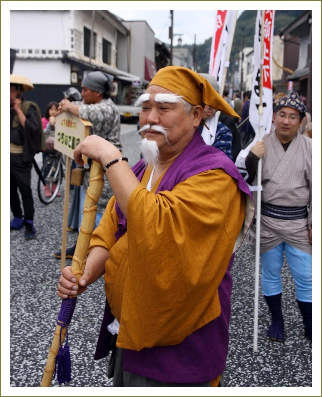 同商工会の役員や地元の3劇団員ら約40人が、代官や水戸黄門、国定忠治、木枯し紋次郎らに扮し、歩行者天国の約500メートルをゆっくりと練り歩きました。 -