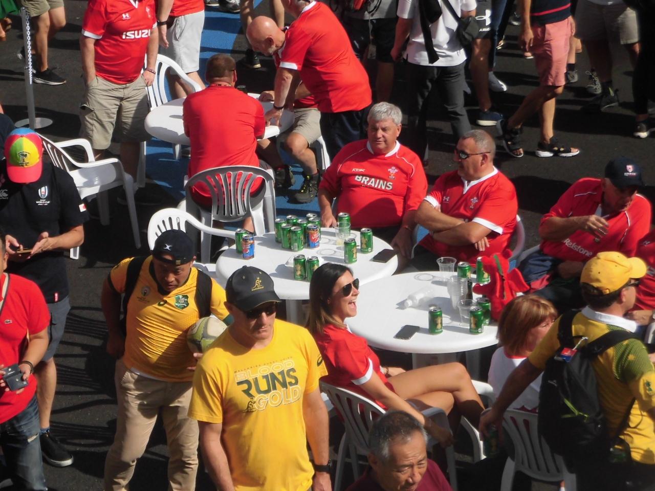 ビール片手に談笑するワラビーズサポーターとウェールズサポーター