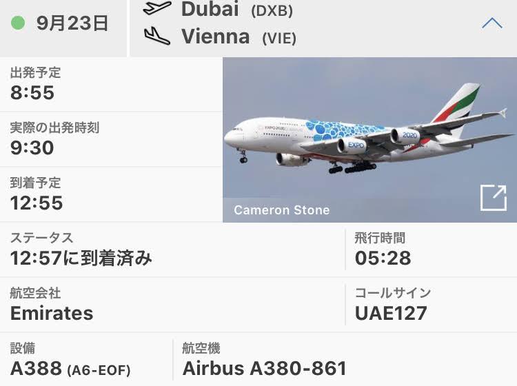 ウィーン(VIE)ー15:30 EK128 23:05ードバイ(DXB)