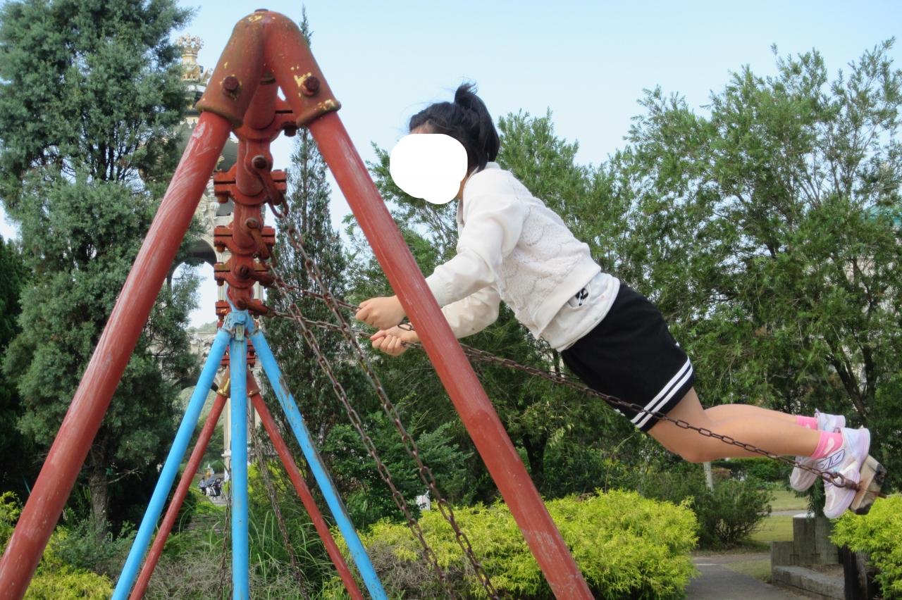 旅行中最高の笑顔でブランコを漕ぐ長女