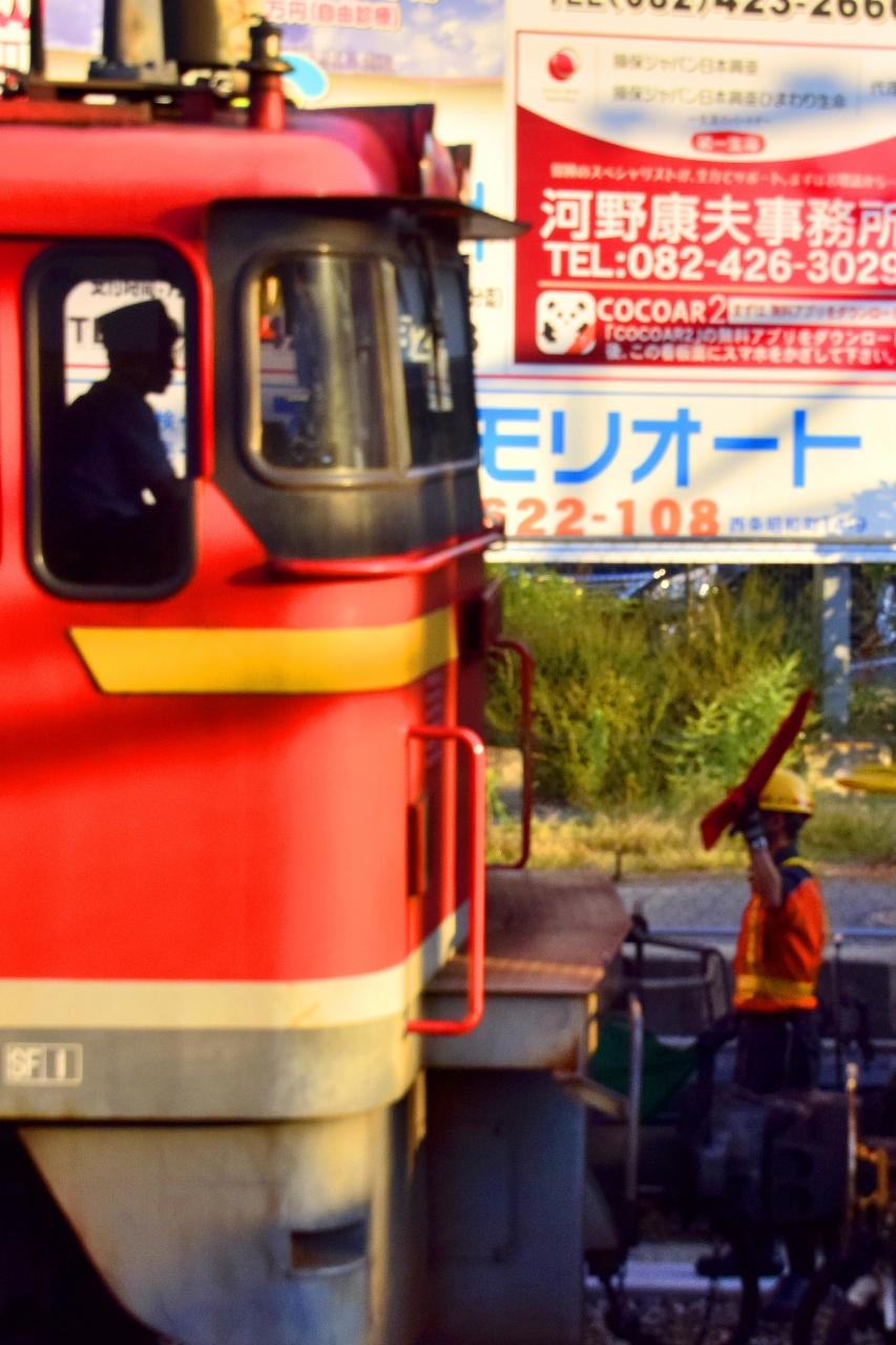 広島貨物ターミナルに向けて走り去る、特徴的なもみじ色をした貴重な国鉄型車両のお姿が見えなくなるまでお見送りします