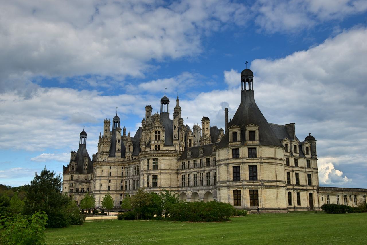 夕日照らしたシャンボール城は青い空を背景に静かに立てて中世の城塞と優雅な宮殿を両方思わせる素晴らしい建築物である。