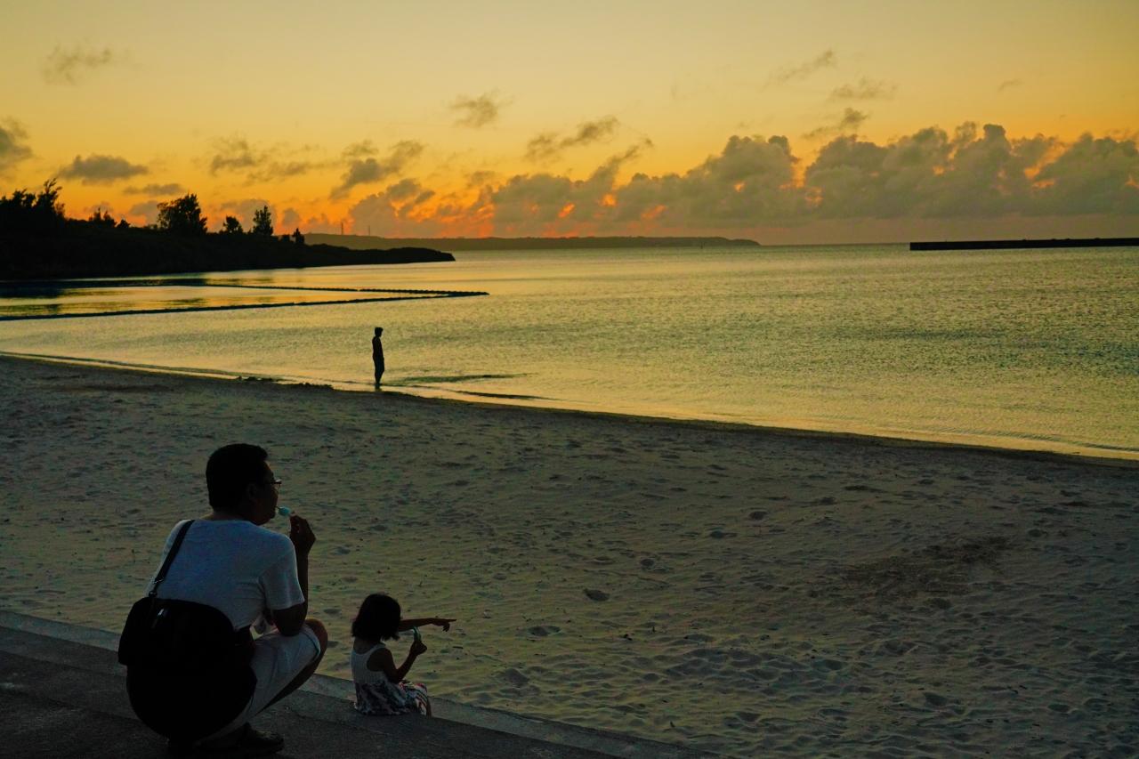 手前にあった東屋でおじさんが一人、三線を弾きながら沖縄民謡を控え目に歌っていてその音色が本当に心地良く、ゆっくりと夕暮れに赤く染まる海の写真を撮りながら