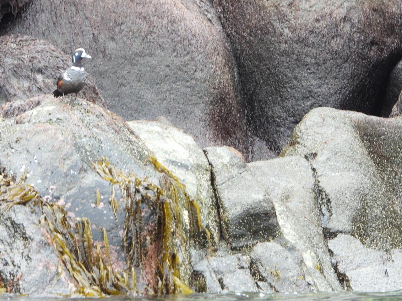 岩の下の陸地にはゴマフアザラシが休憩中。
