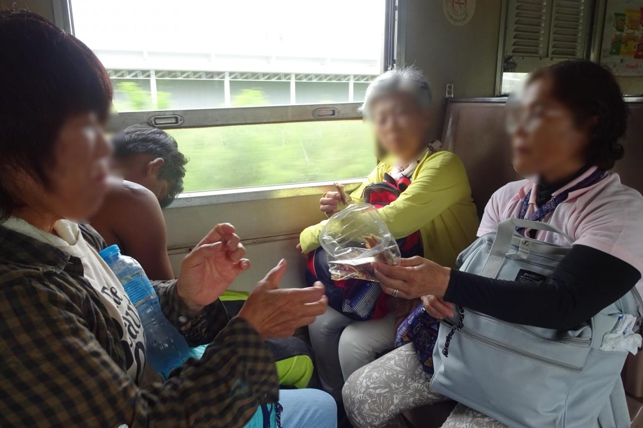 2等車から3等車に移り、お布施をつまみながらお喋りタイム。