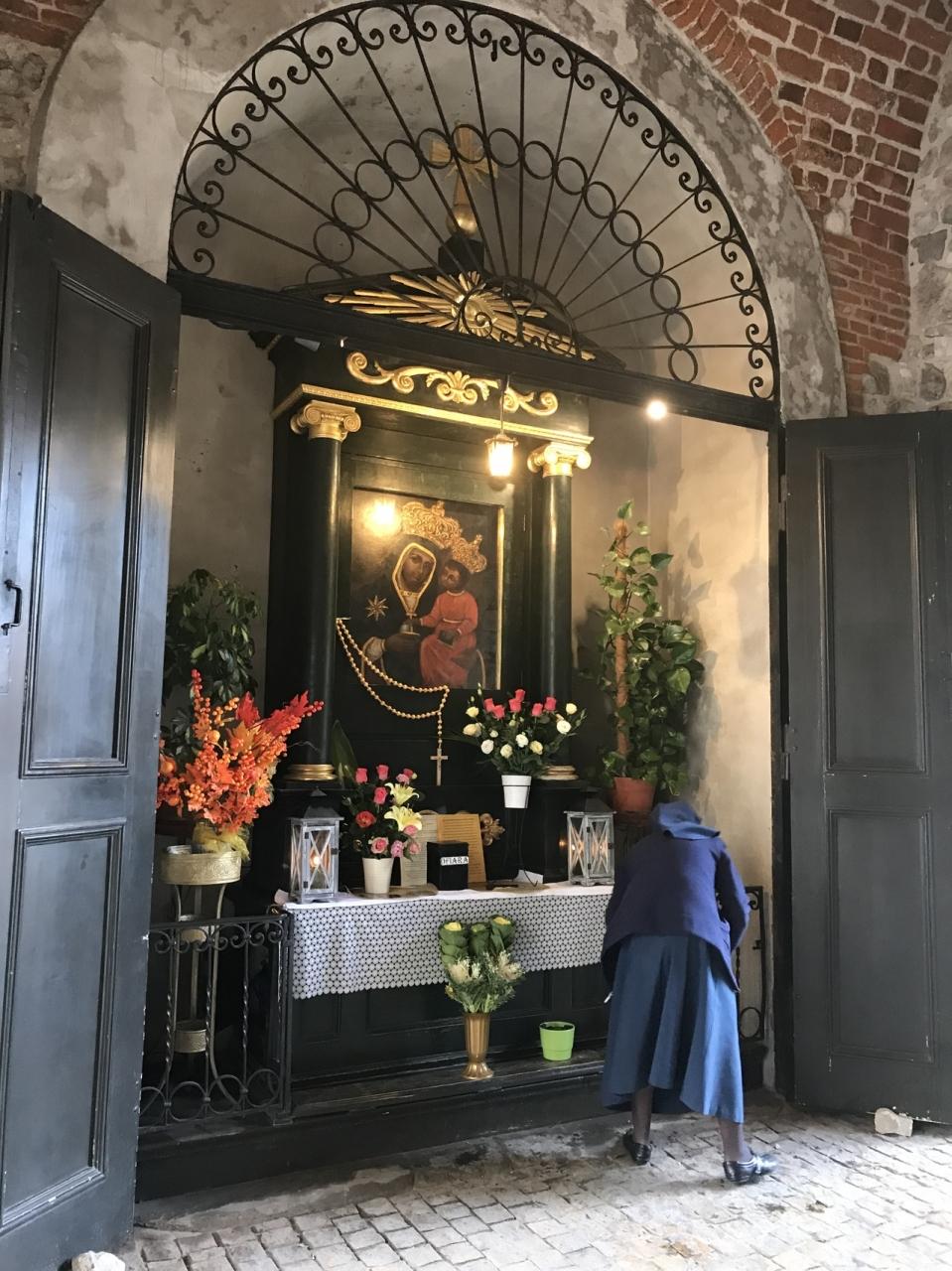 クラクフ 旧市街への入り口の門で朝の準備をするシスター