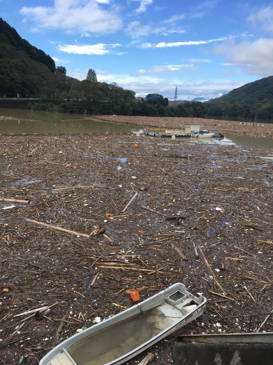 ダム湖・津久井湖は流木やら何やらで埋め尽くされている