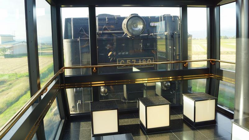 グリーン車が車両端に連結され、グリーン席を取っていないと展望台には入れない。展望台といっても、会津若松発の下り列車では、SLのお尻が見えるだけ。窓は開けれ無いが、微妙にすすが入ってくる。