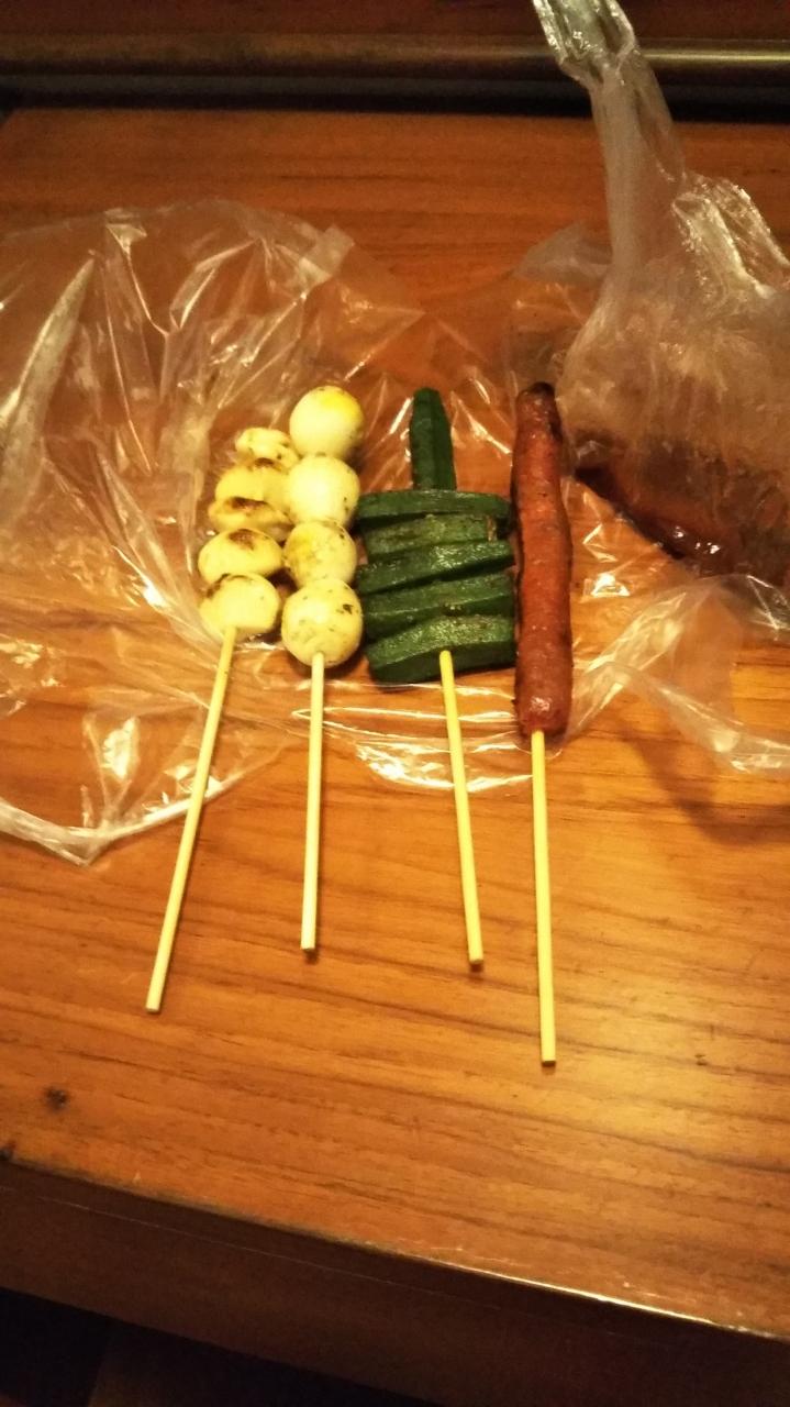 ナイトバザールの道路の中央には焼き豚の屋台が何軒かあった。良さそうな店でニンニク、オクラ、ウズラ卵、ソーセージを買った。