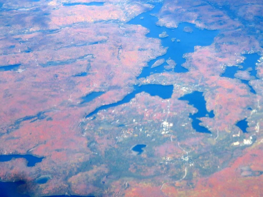 飛行機は時刻通り出発。晴れていたので、上空からは紅葉の山とビル群がきれいに見えた。昨日行ったMont Royalか?