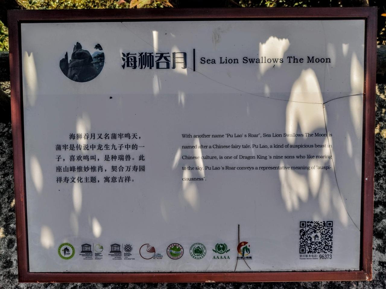 「この花崗岩の岩は高さ約7メートル、直径約4メートルで、猿の王様が宝物を持っているように見え、山の頂上にあるため、「モンキーワングァンバオ」と名付けられました。花崗岩体が割れ目(ジョイント)で切断された後、重力崩壊と球状の風化作用によって形成された絵文字の風景です。」三清山ホームページより -