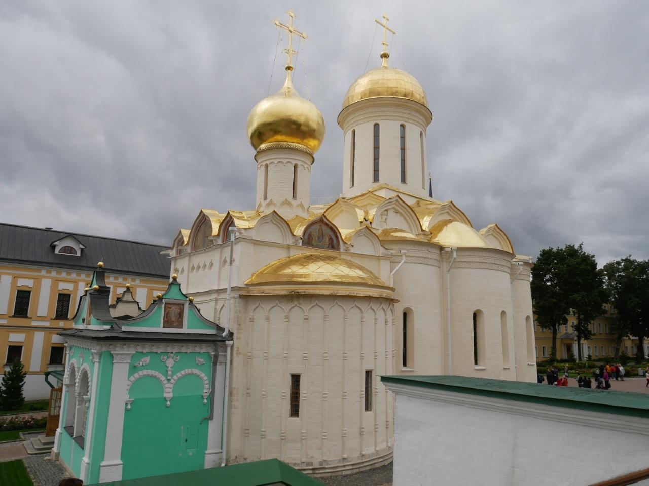 ここセルギエフ・ポサードのウスペンスキー聖堂の外観は、キリストをあらわす金色屋根を中心に、周囲に聖母マリアをあらわす青色屋根が配された、とてもポップな色合いの美しいもので、まるでおとぎの国のお城のよう。 -