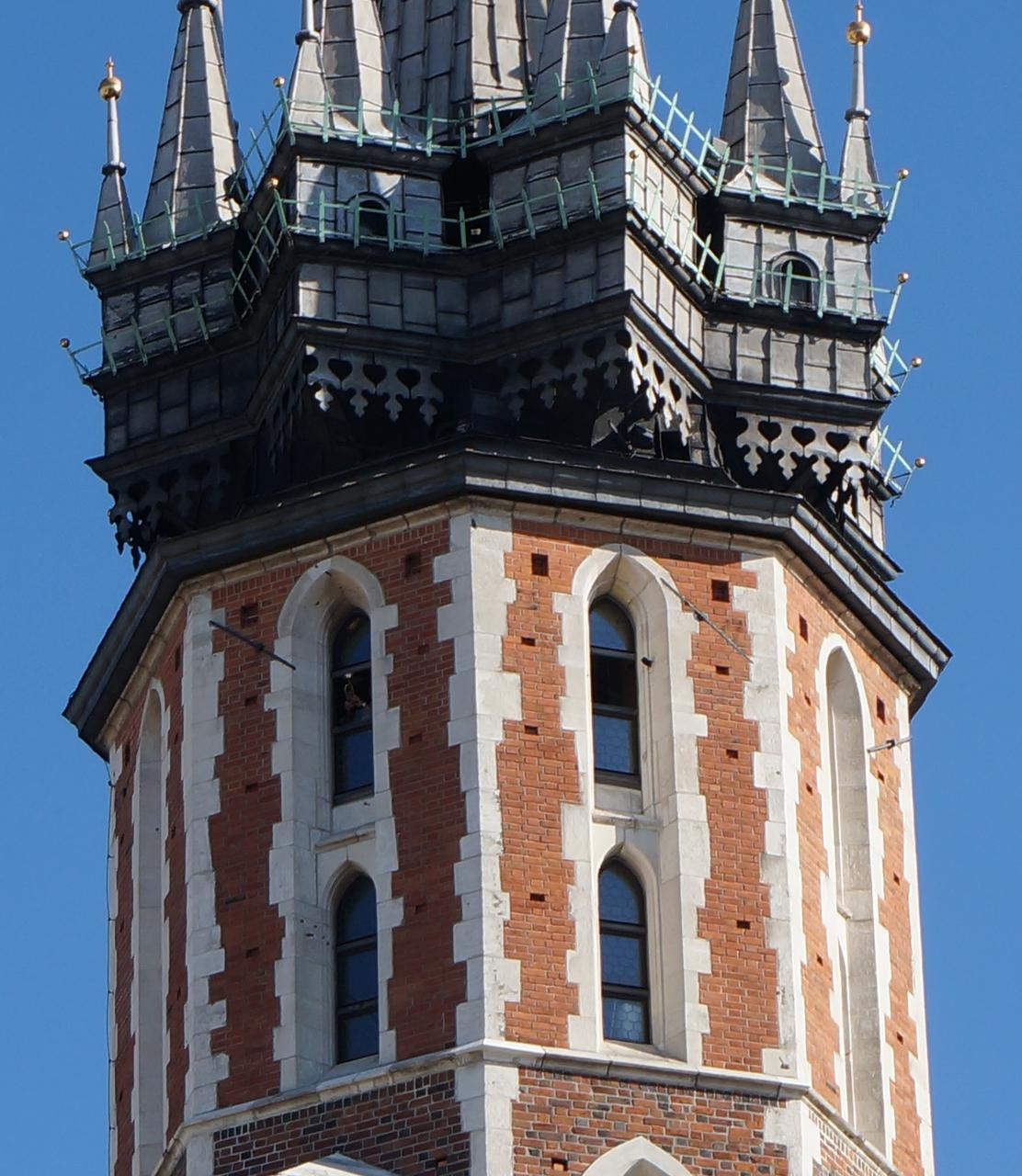 聖マリア教会の塔の窓からトランペットを吹いてます(左の上段の窓)
