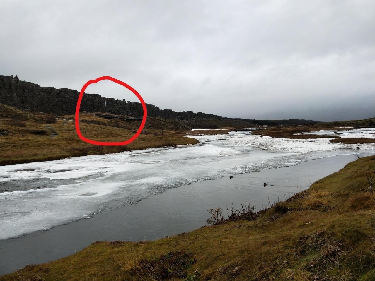 5分ぐらい歩いていくと、この旗のある場所に着きます。ここはアルシングと呼ばれる、930年に世界で最初の民主議会が開かれた場所なんだとか。後ろの岸壁に声がよく響くかららしい。声を出してみると、たしかによく響きました。