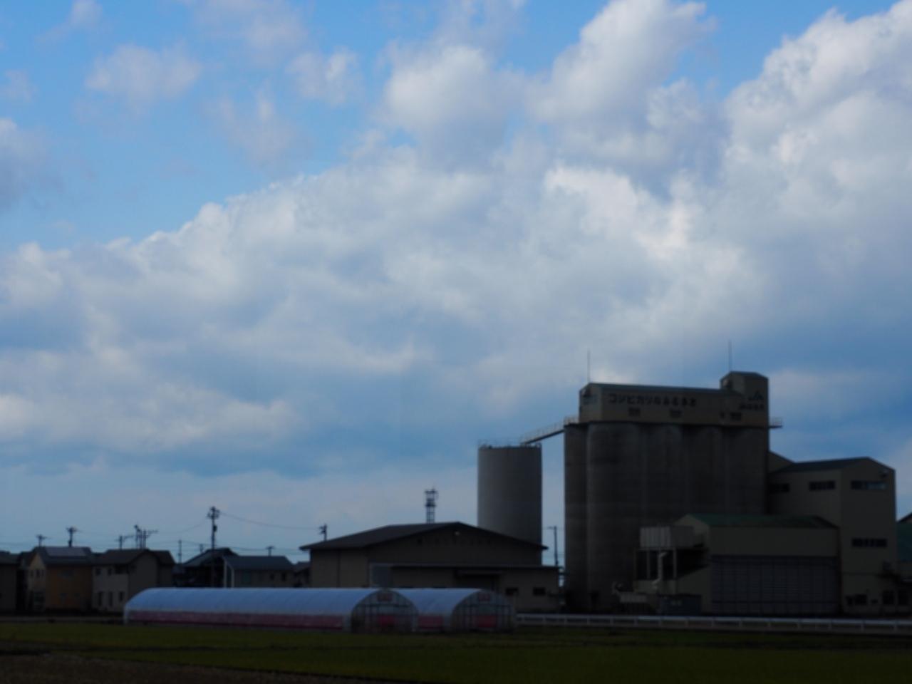 いつしか空には晴れ間も。巨大な穀物倉庫には「コシヒカリのふるさと」の文字が誇らしげに。