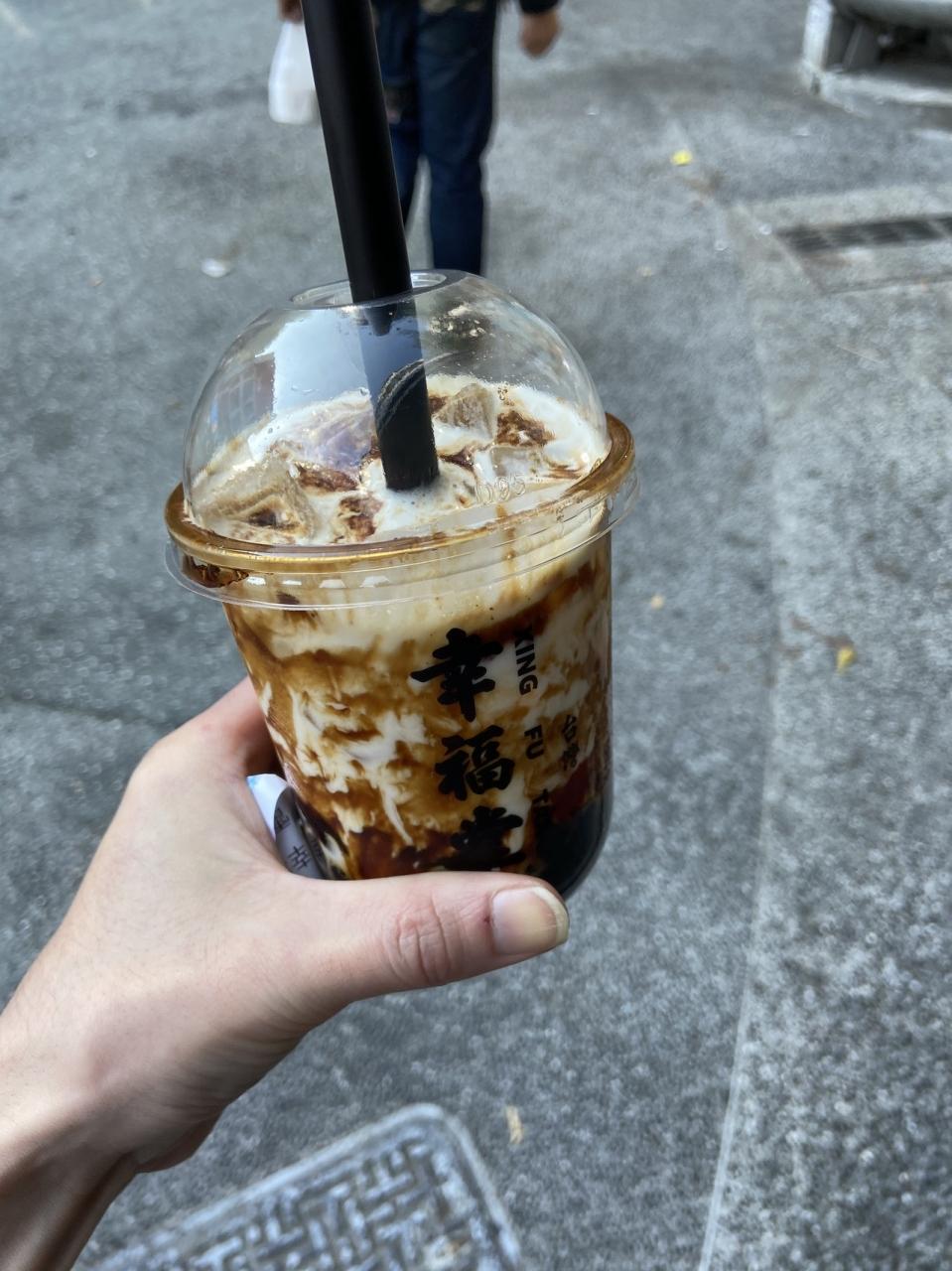 幸福堂、わからないので一番オーソドックスな黒糖タピオカミルクにしました。タピオカがモチモチで美味しいかったです。流行るのがわかりました( ^ω^ )75元で300円いくかいかんかぐらいです。
