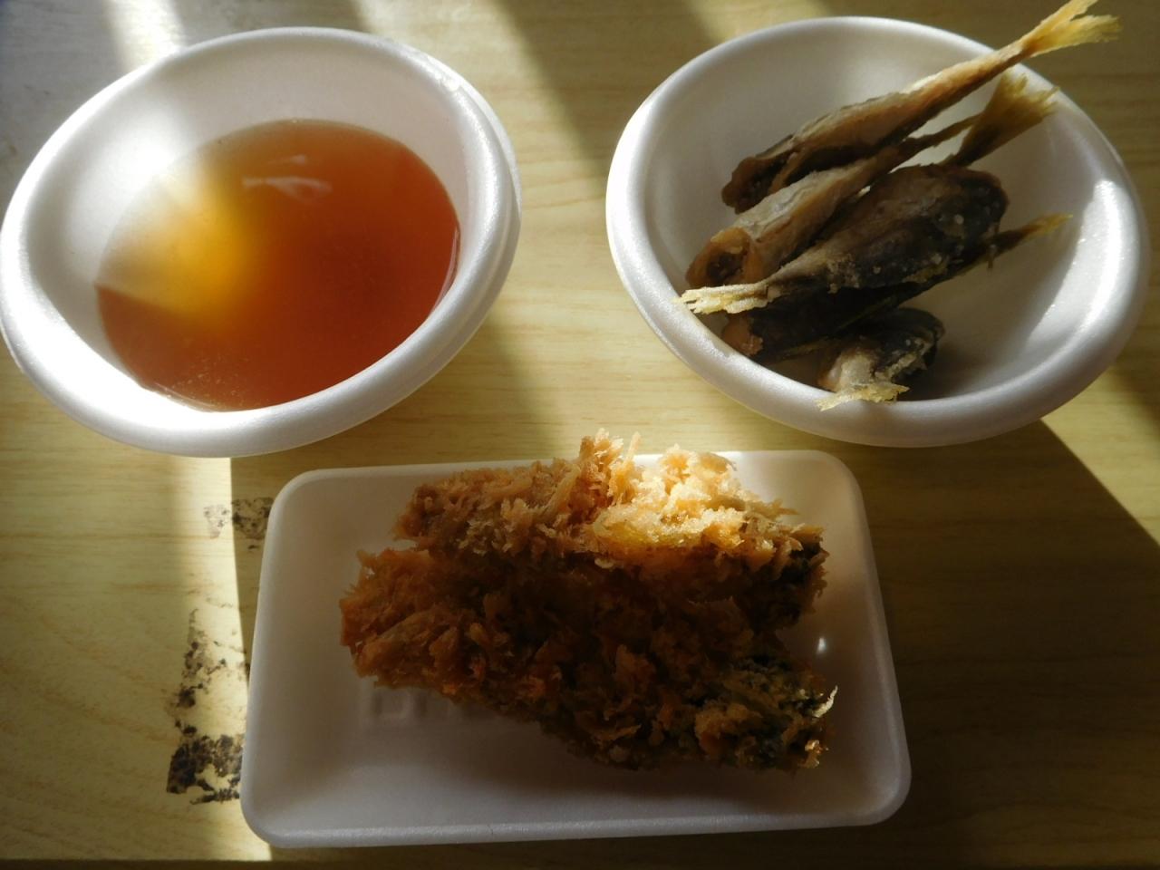 さらにカキフライとアジフライ。スープはサービス。合計で税込み648円。やはり消費税は持ち帰りの8%で計算されていた。