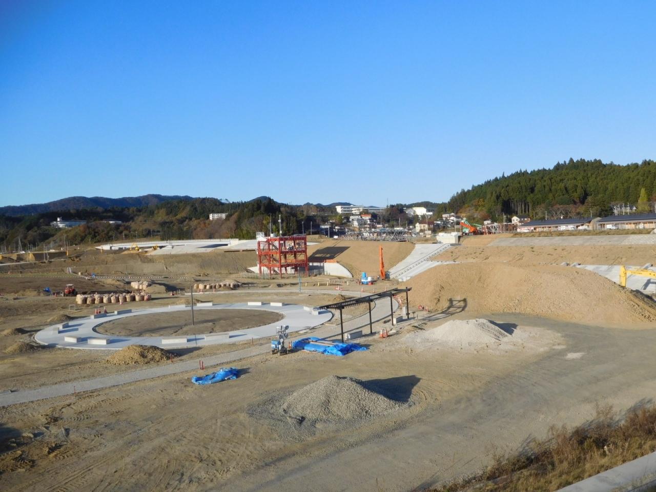 写真中央に鉄骨だけが残された旧防災対策庁舎。この辺りは整備して公園になるのだろうか。右奥にさんさん商店街が見える。
