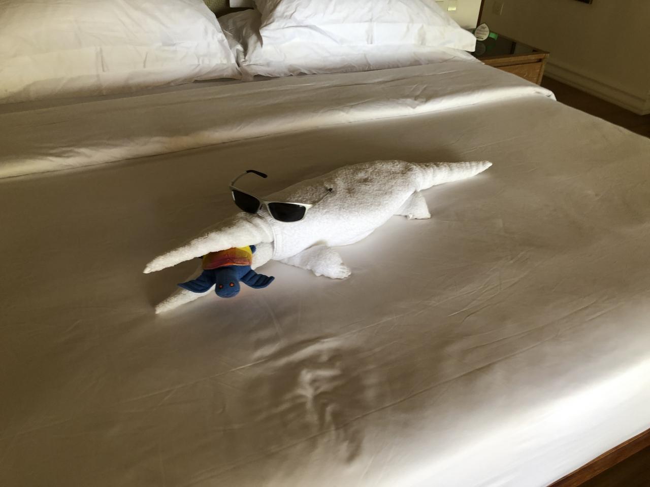 部屋の戻るとワニがベットでお出迎えしてくれます。