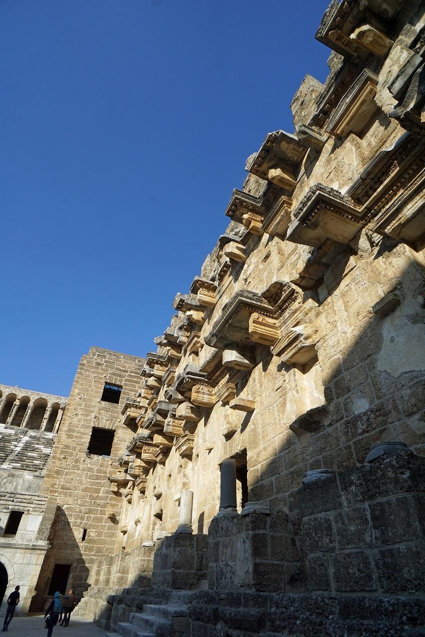 この劇場は地中海世界に残る古代ローマ遺跡の中ではほぼ完全な形で残っていると言っても過言ではありません。野外劇場の南側の入り口にはこの劇場がマルクス・アウレリウスの治世の時代に建設され、建築家は地元のアスペンドス人であるゼノンであると刻印された跡が今も残っているそうです。