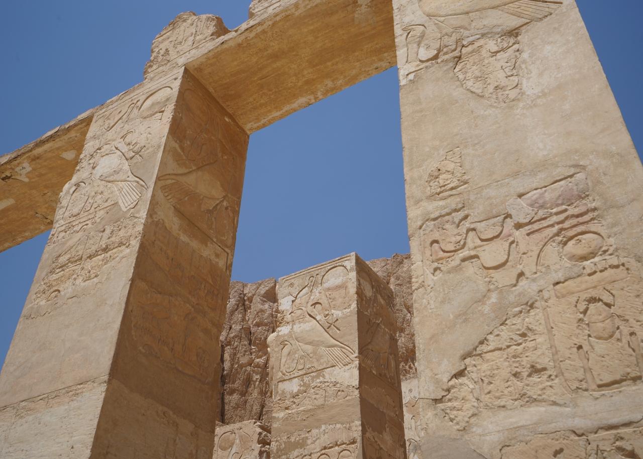 ハトホル礼拝堂の前柱廊です。柱にはホルス(ハヤブサ)やコブラ、スカラベなど様々なモチーフのレリーフが見られます。