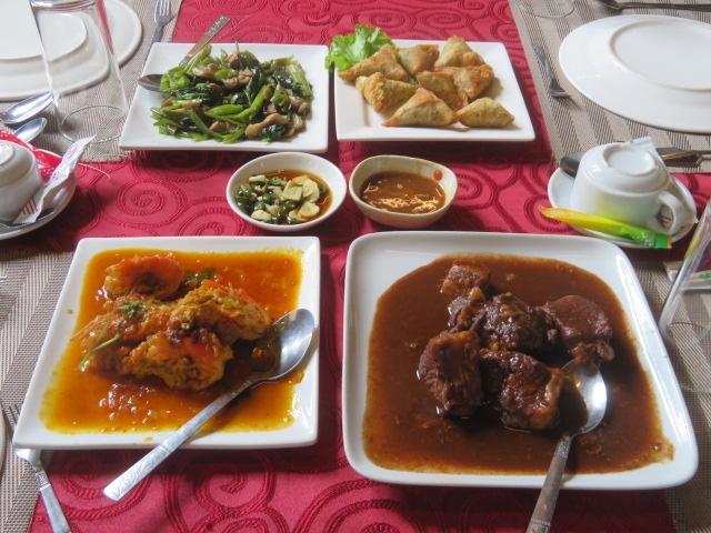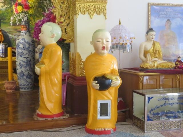 駐車場から長い階段を上りました、入口で裸足になり、幅の広い階段をしばらく上ると大きな大仏の前の広場に到着、ちょっと歩くと本堂内入ります、中には仏像が並んでいました、多くの参拝者が来ていました、本堂内を見た後は広場から周囲の景色を見て元の駐車場に戻りバゴーに、途中1回ドライブインでトイレ休憩をしてバゴー市街に入りシュエモードーパヤー近くのレストランハンターワディーで昼食を取りました、ツアーで利用されることが多いミャンマー料理のレストランでお土産販売コーナーもありました。