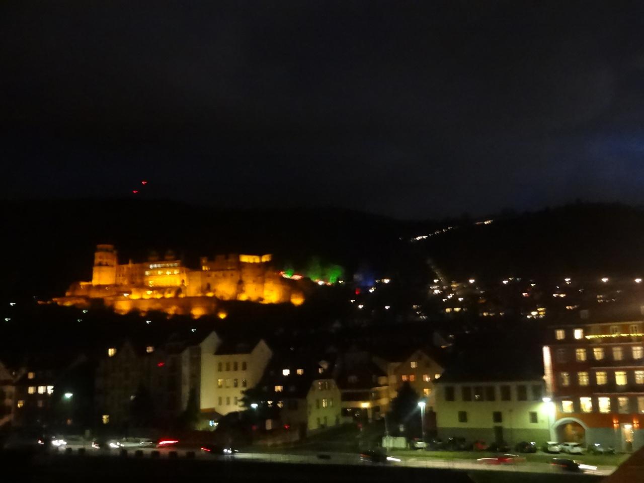 こちらの広場のマーケットの背後にはライトアップされたハイデルベルク城が。