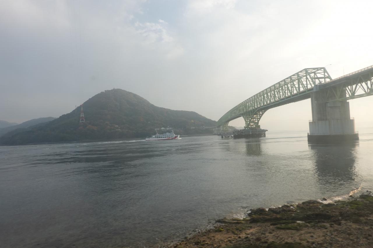 東は三浦湾:少し右に振ると、船を東西に通すために切り開いた万関瀬戸に架かる万関橋が見えています。