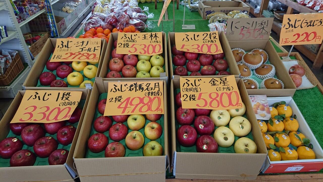 「三沢市青果市場」の店内です。地元の果物、野菜、食品が色々と並んでいて、見応えあります。やはり、青森名物のリンゴがまず目に入ります。