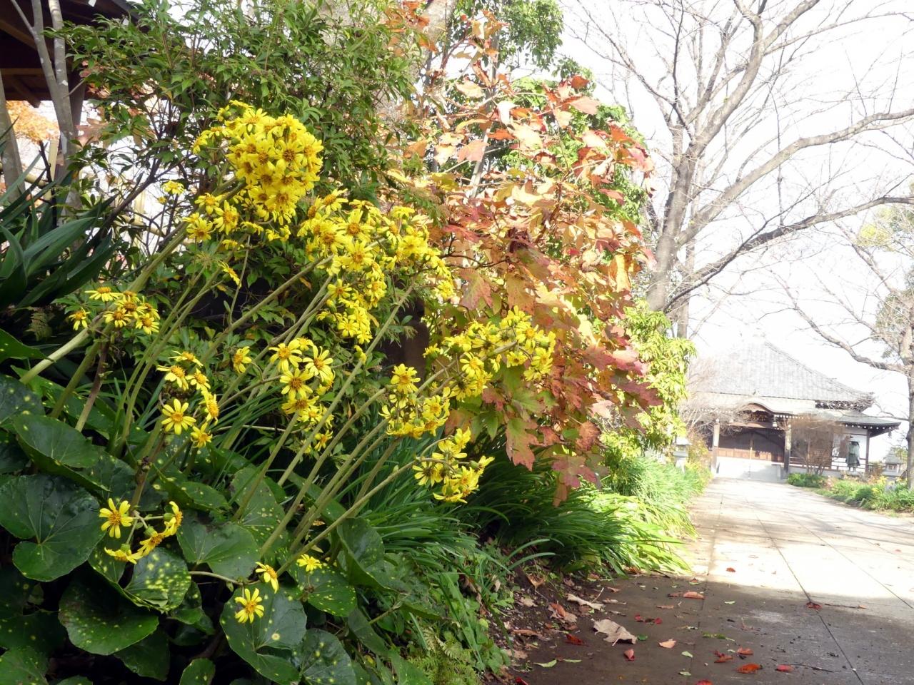 「常楽寺」の駐車場の端、山門の横には紅葉が残っていて、その隣にはサクラが咲いていて、その下にはツワブキが咲いています。鐘楼の向こうは枯葉ですが、この紅葉は未だ紅葉です。