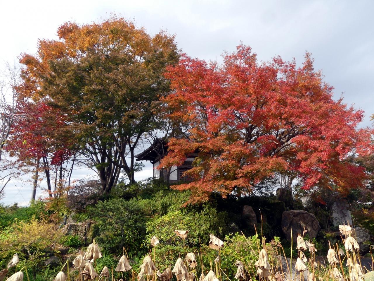 枯始めたツワブキと、枯れたハスと、紅葉と、枯葉の木と、そして「太子堂」です。