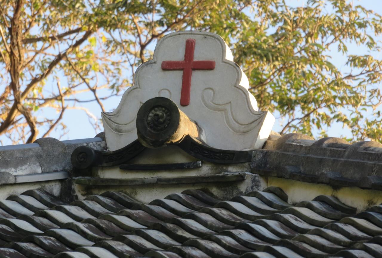 『大野教会堂』の屋根の上に建つ、赤い十字架の光景です。1893年(明治26年)に竣工しました。2004年(平成16年)に解体修理が行われ、2008年(平成20年)、国の重要文化財に指定されました。
