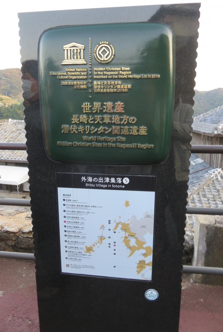 『長崎市外海の石造集落景観』のタイトルがあった説明パネルの光景です。日本語説明文は、『出津川流域の狭くて急な地形で営まれる、近世から続く畑作を中心とした生業の集落景観。扁平で加工しやすい結晶片岩を主とする地質が特徴で、集落には、石垣、石築地、石塀、石壁など結晶片岩による数多くの石積み構造物が所在しています』と紹介されていました。