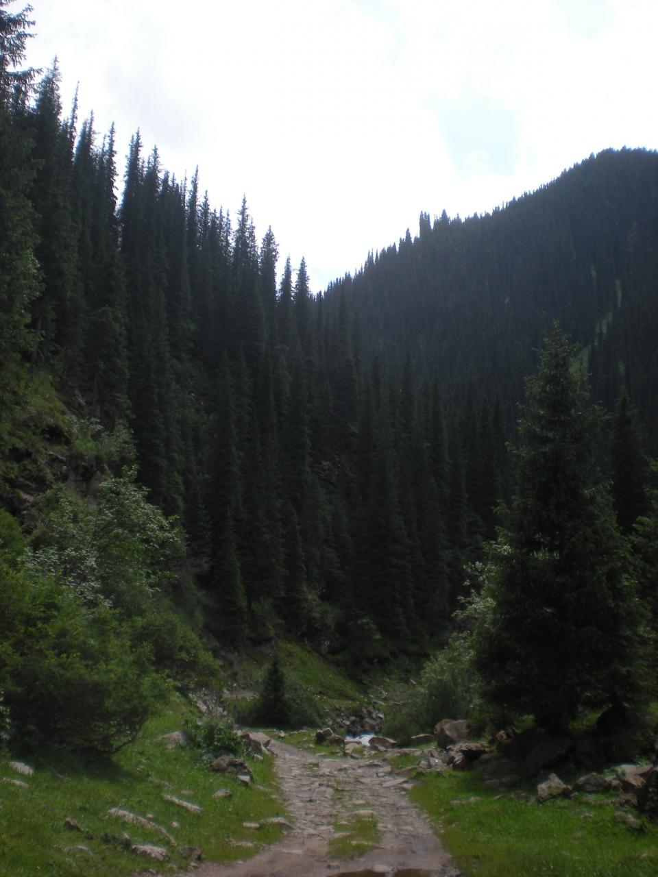 トレッキングは基本上流から流れて来ている川の流れに逆らって登って行く感じで、周りの木々もカザフスタンに似ており、高い針葉樹が綺麗だ。