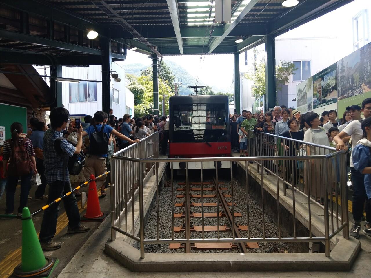 激しく混んでいるケーブルカーに乗り