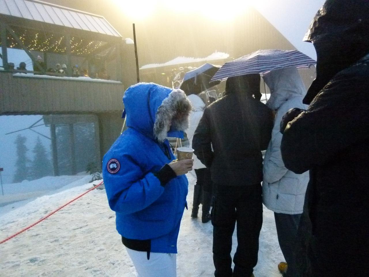 列に並んで待つことしばらく、Peak Chaletに到着。振り返ると列は依然として長らく伸びています。雪も吹雪いてきたので、帰る人も増えてきた様です。