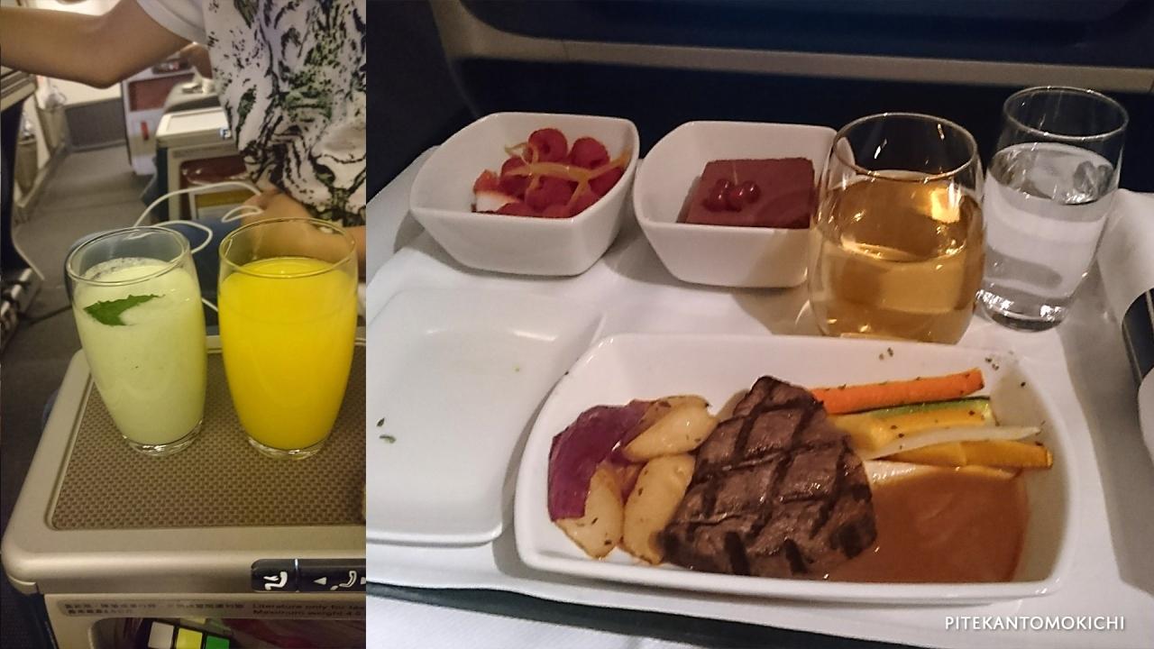 次男は「行きで食べたステーキまた食べられるかな?」と深夜なのに機内食にワクワクしています。あなた、さっきラウンジで結構食べてましたけど。。。 -