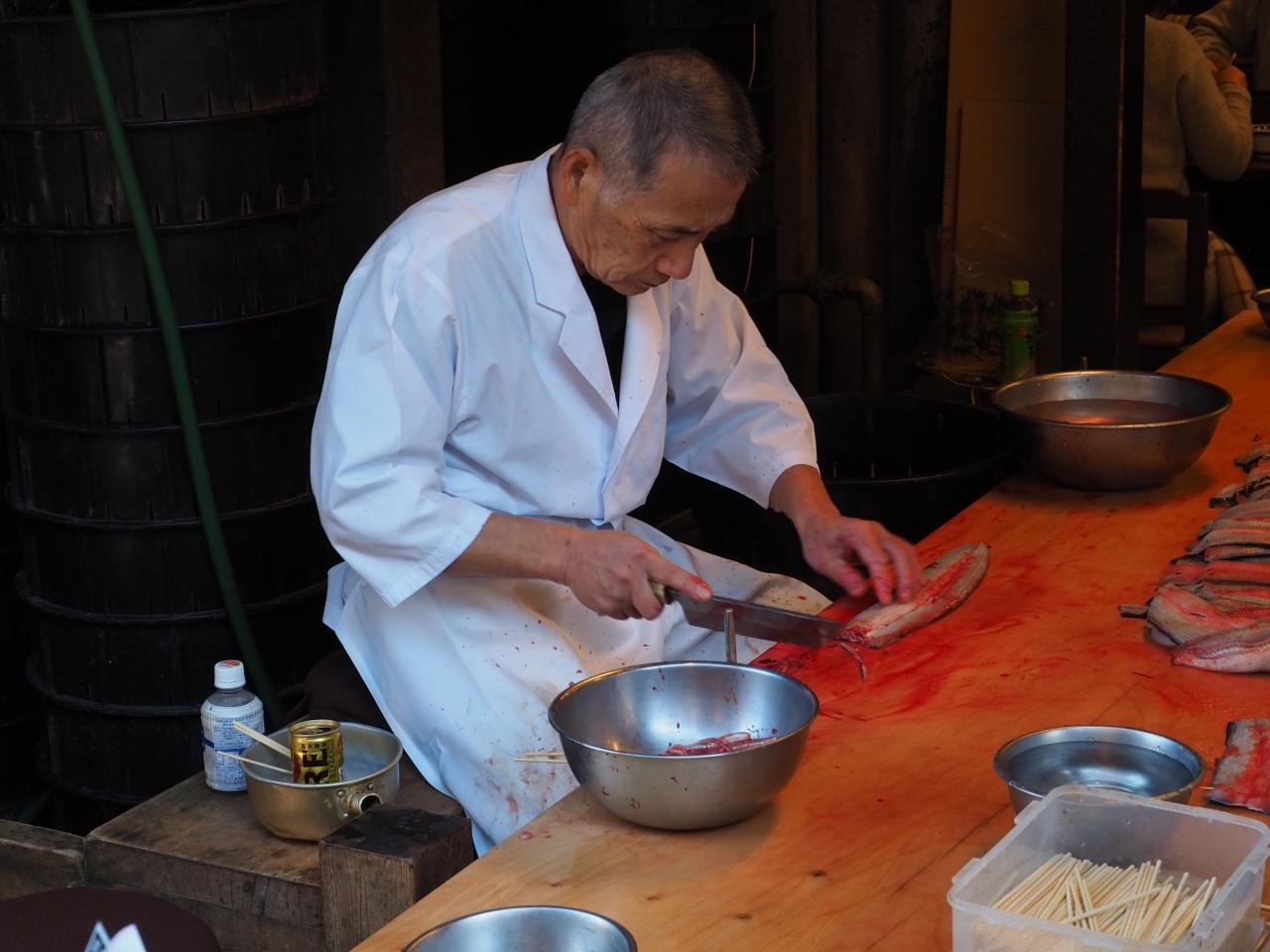 店の軒先で、ウナギ捌いてます。チョットびっくり!
