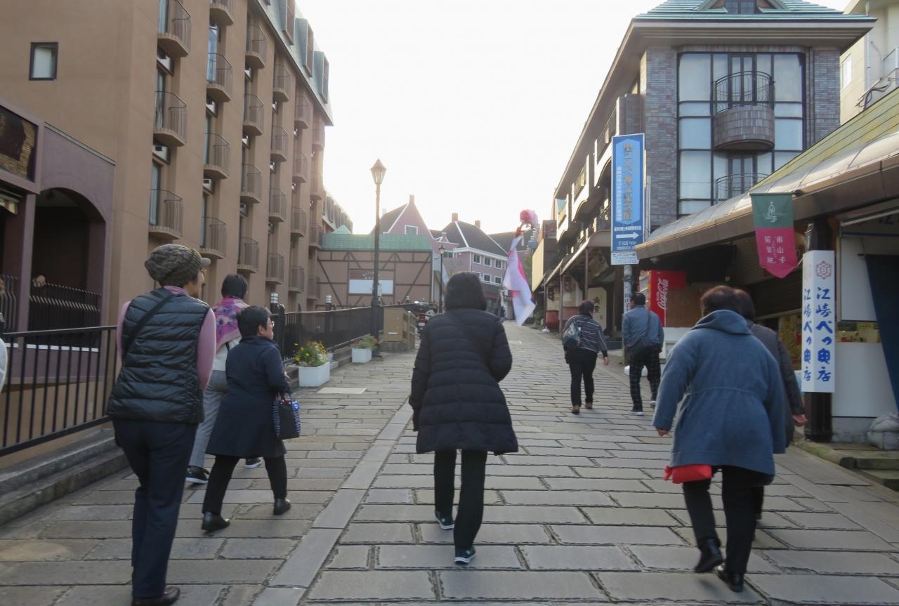 迎えの観光バスで坂を下り、港近くの駐車場で車を下りました。この後は、1時間少し、自由時間での『グラバー園』や『大浦天主堂』の見学です。ホテルから坂を下りて港方面に向かう途中、泊まった『矢太樓・矢太樓南館』を見上げましたが、崖地に建てられたホテルであることがよく分かりました。