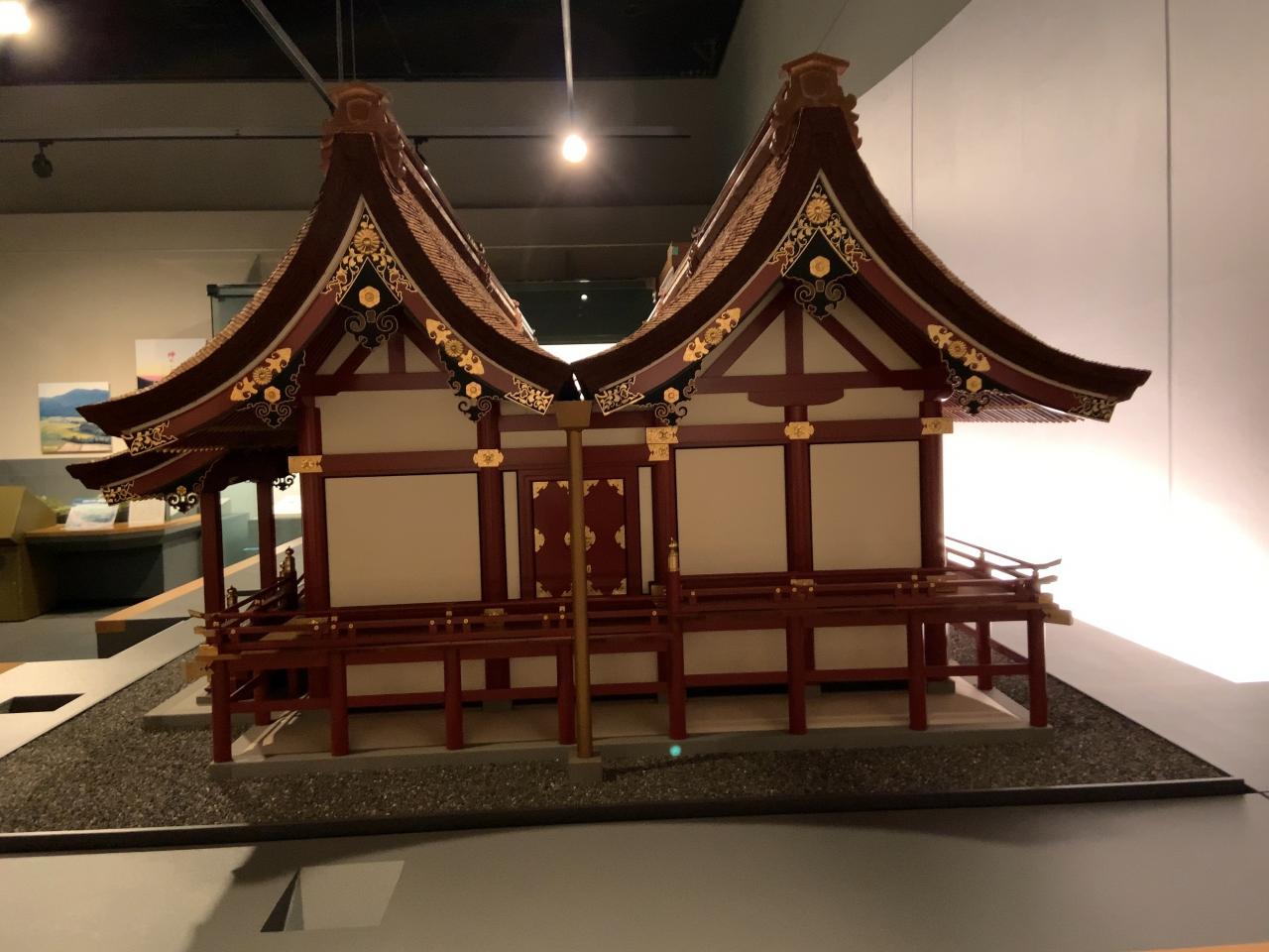 宇佐神宮の模型ですが、宇佐神宮の本殿は3つの社がつながっているような造りをしています。しかし、実際にはつながっていないことや、雨水を処理する樋があるという話でした。