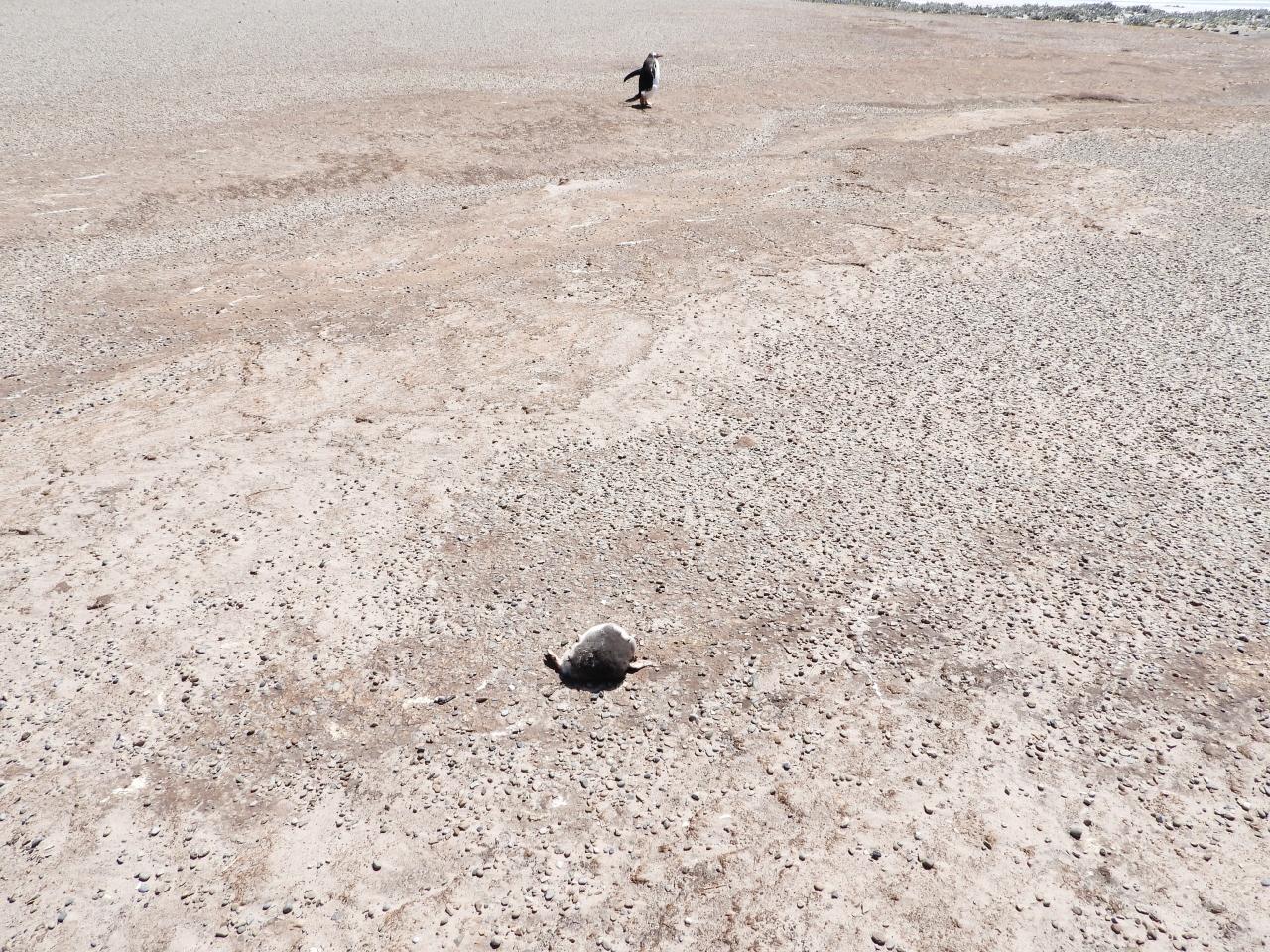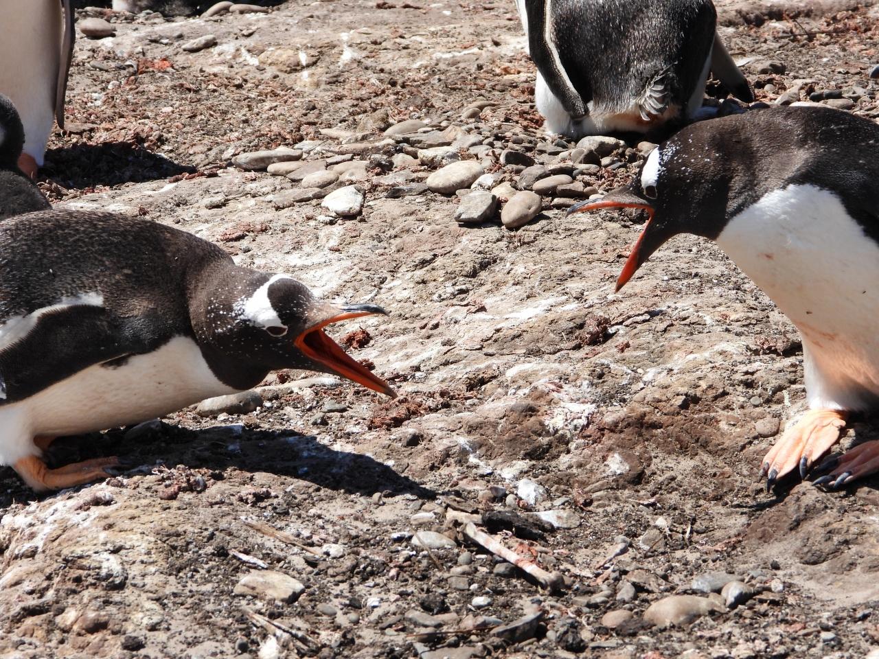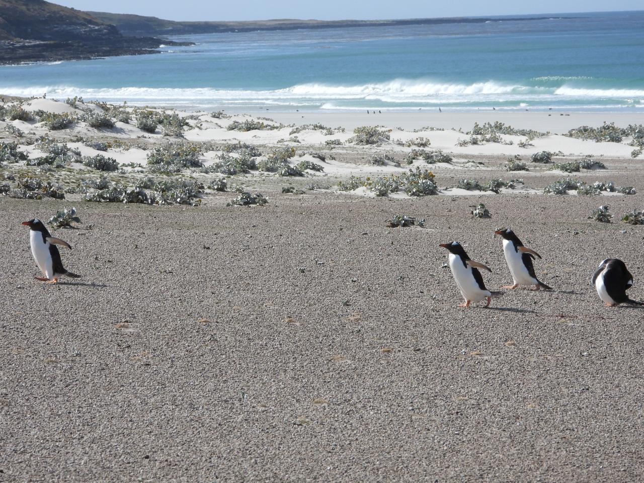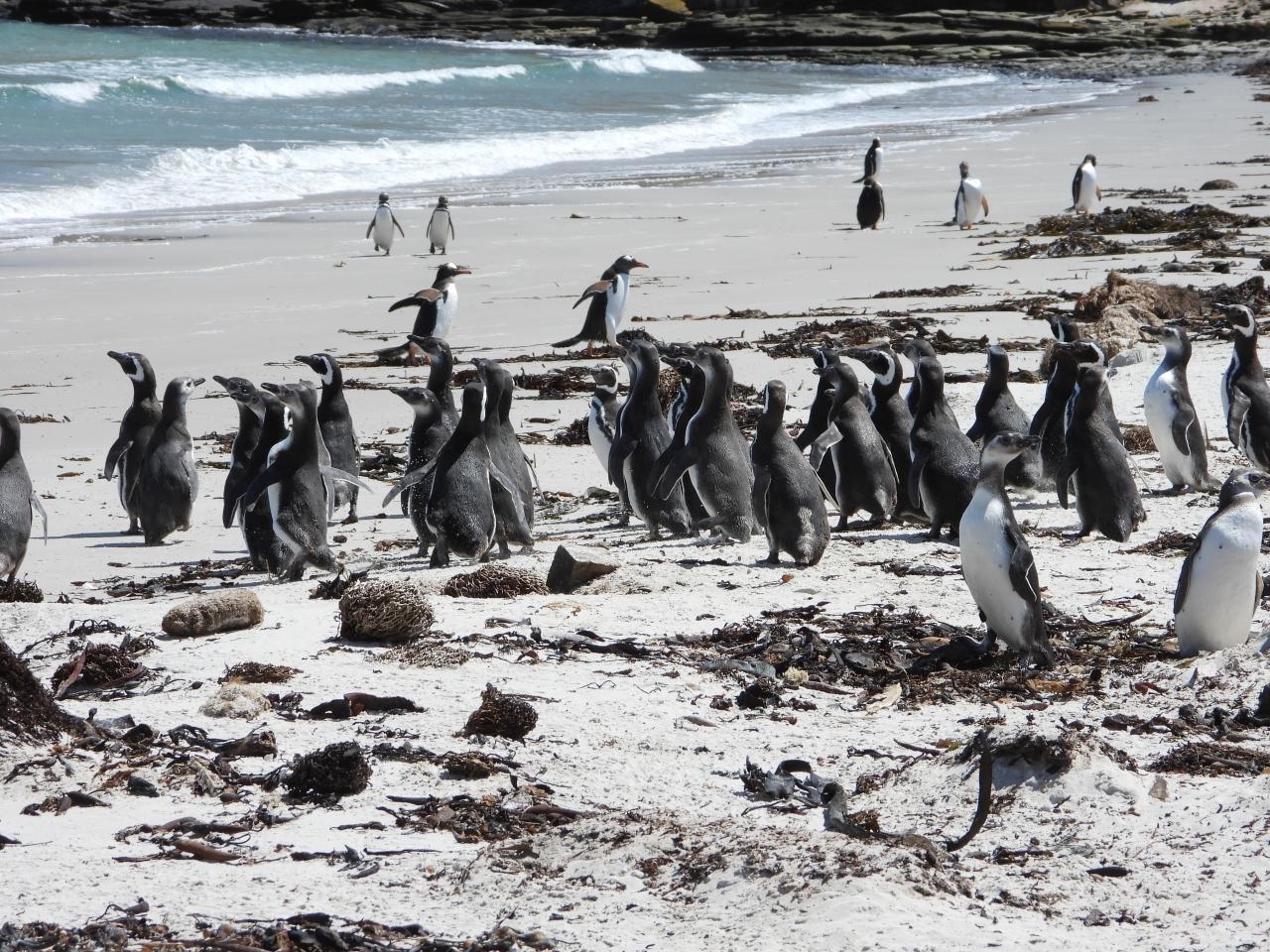 佇むマゼランペンギンとコロニーへ向かうジェンツーペンギン