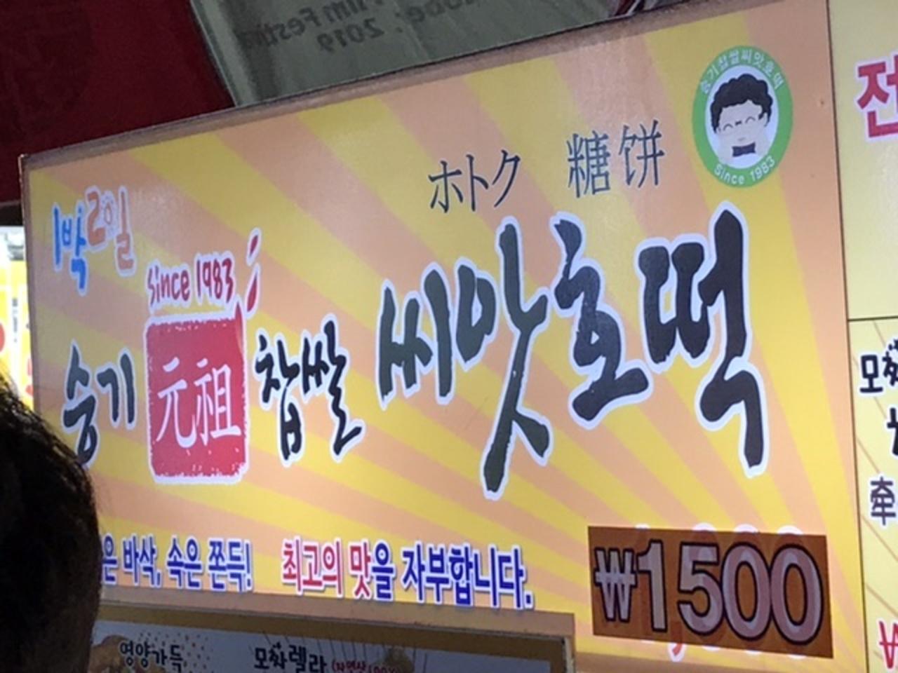 「スンギ・元祖・チャプサル・シアホットッ」。スンギ元祖シアッホットク 露店・屋台