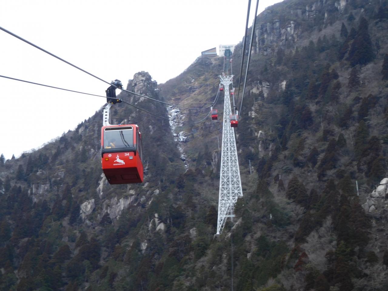 御在所ロープウェイ。標高600mくらいから1000mくらいまでを13分で一気に登る。ピストン運転で待ち時間はない。