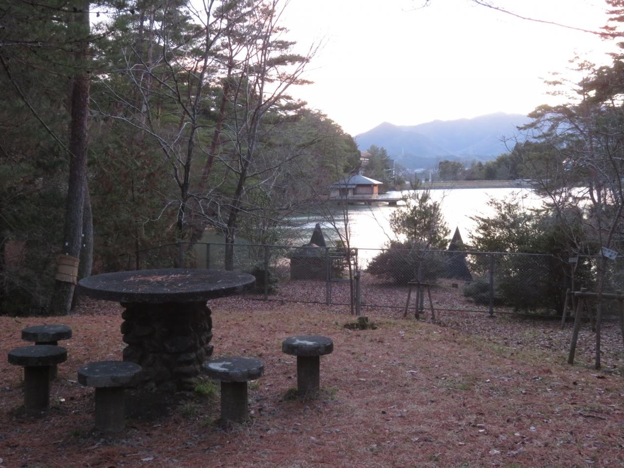池のほとりの休憩所の日没前の景色