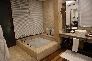 昼間だと、入浴しながら、窓を隔てて、テラスにあるプール、そして海へと眺望が広がっていました。