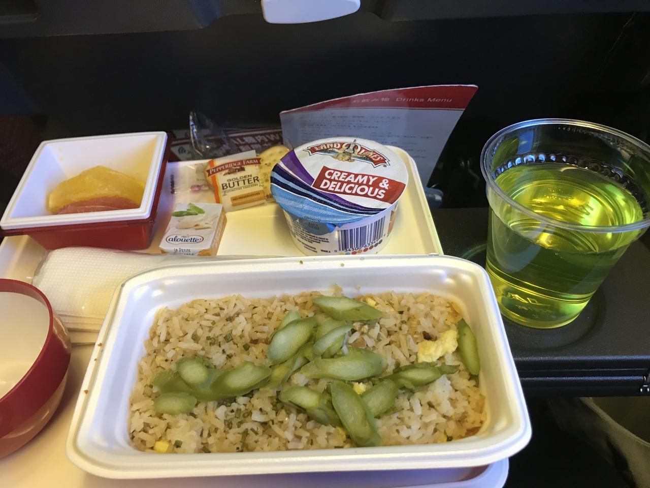 何か選べるとかと思ったら、チャーハン一択でした。あとJALキゥイジュースをいただきます。 -