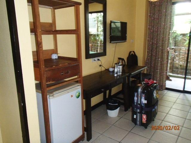 冷蔵庫。テレビ、電気ポット、シャンプーあり。歯ブラシなし